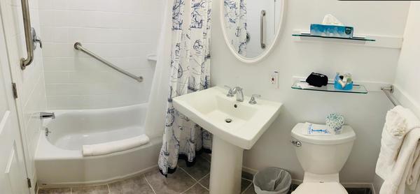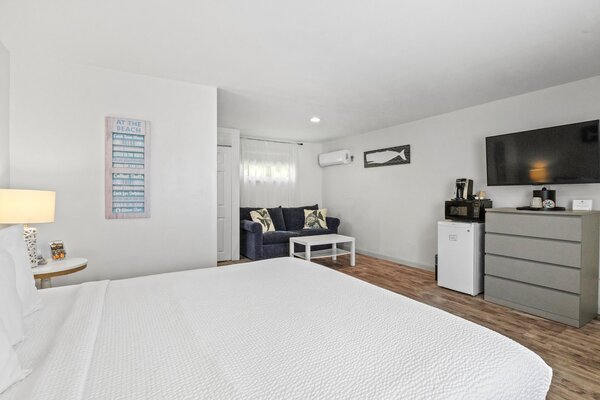 Larger sized room with one King Bed w/ couch located poolside / Non-Smoking/Pet-Free/Adults-Only and full bathroom with tub.